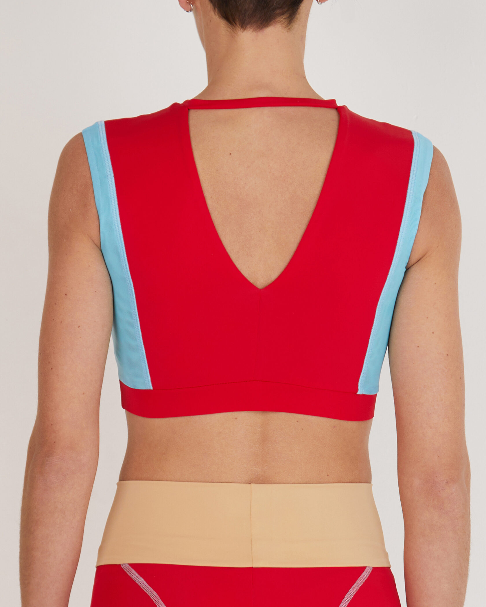 Comfortable cups and wide combined straps support the bust with a V-back finish. Graphic seams and double-layer mesh side inserts improve airflow during training.