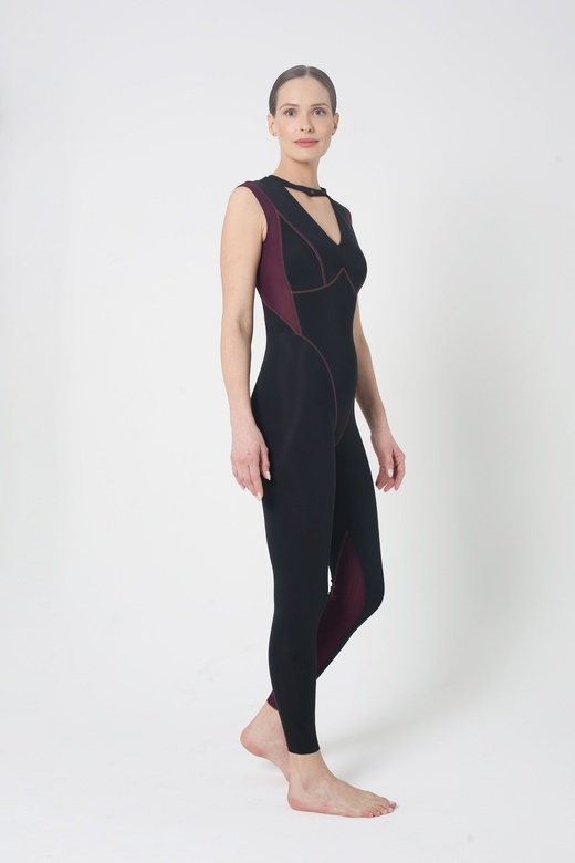 Deep neckline balanced by a snap choker with decorative length and no discomfort. Double-layer mesh details enhance airflow, while a double biflex layer shapes the abdomen.