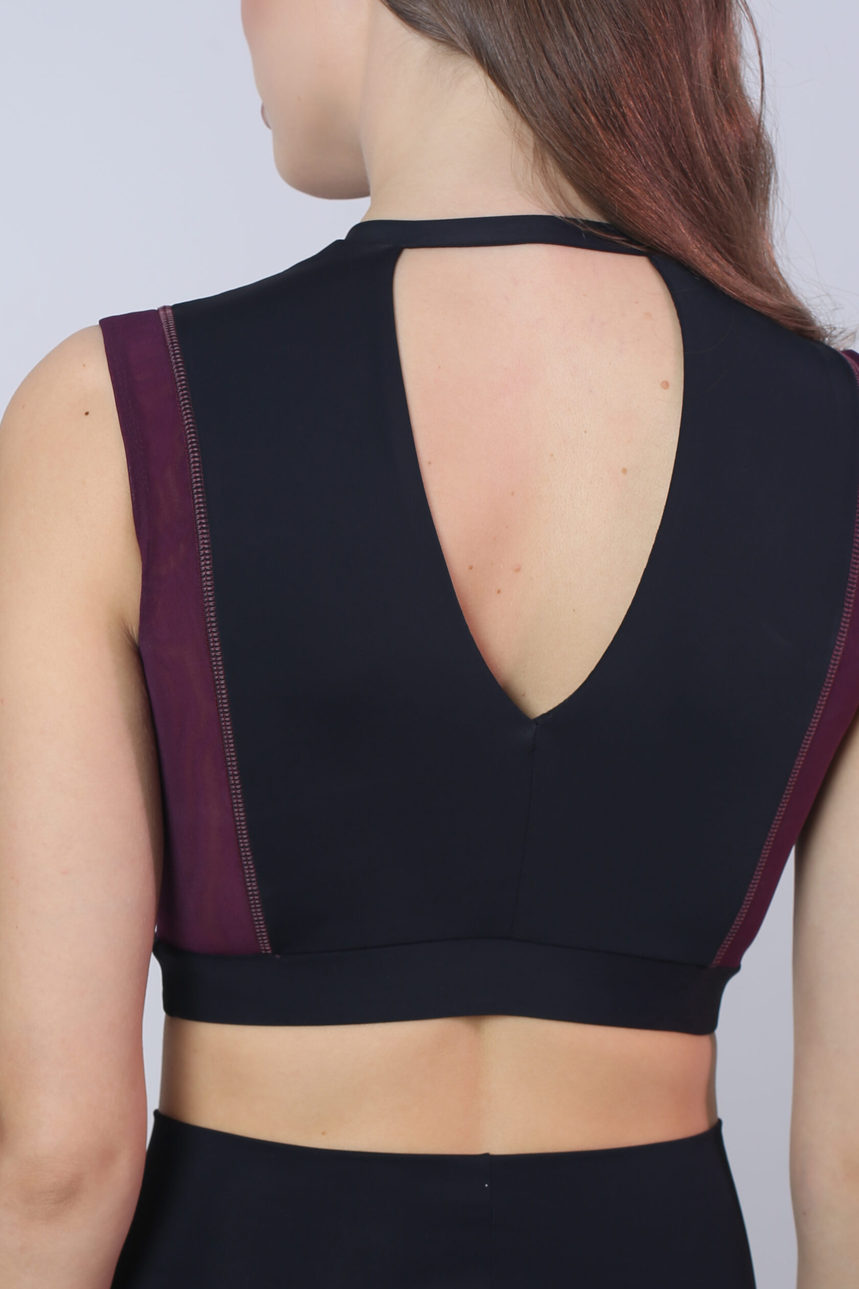 Sport crop top with a deep neckline, sculpted darts, and a snap choker closure. Double mesh panels and a wide elastic band keep it secure; removable cups included.